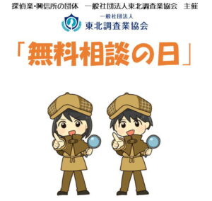 探偵業の選び方、契約の点検、意見、苦情について「無料相談の日」を平成30年1月17日(水)次のように開催します。 ・電話相談10~14時 ・対面相談14時~18時(要予約) ★電話番号019-661-8060 ★対面相談 岩手県盛岡市三ツ割一丁目9番7号 当会事務局応接室 盛岡駅から車で10分、徒歩30分、バス岩手県交通「坂の下」下車1分 (無料相談の日以外でも相談は受け付けておりますが回答まで日数をいただく場合があります。この機会にどうぞ)